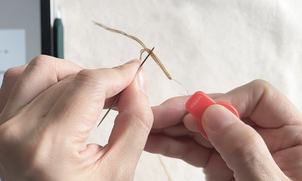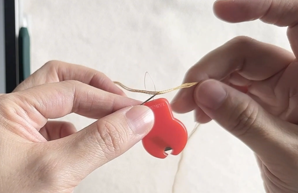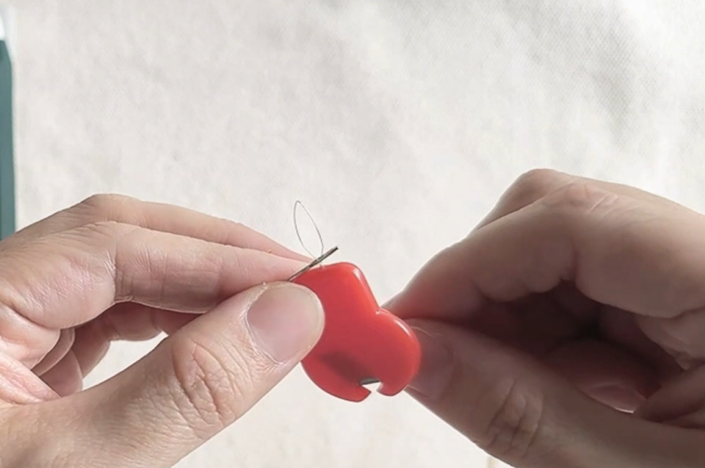 刺繡線比較軟、不容易直接穿過針孔,這時我們會用穿線片來幫忙