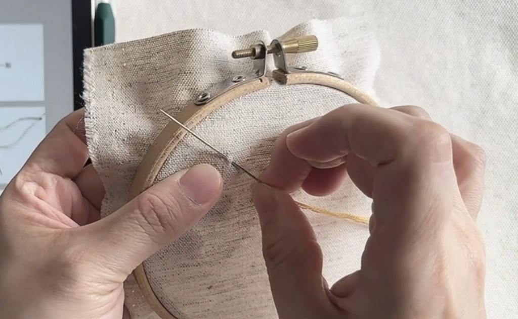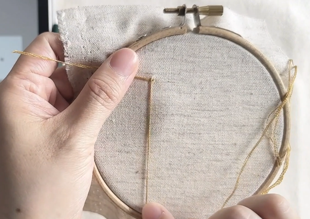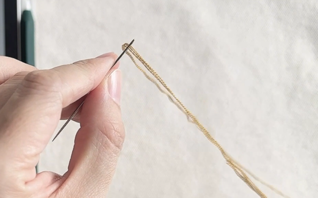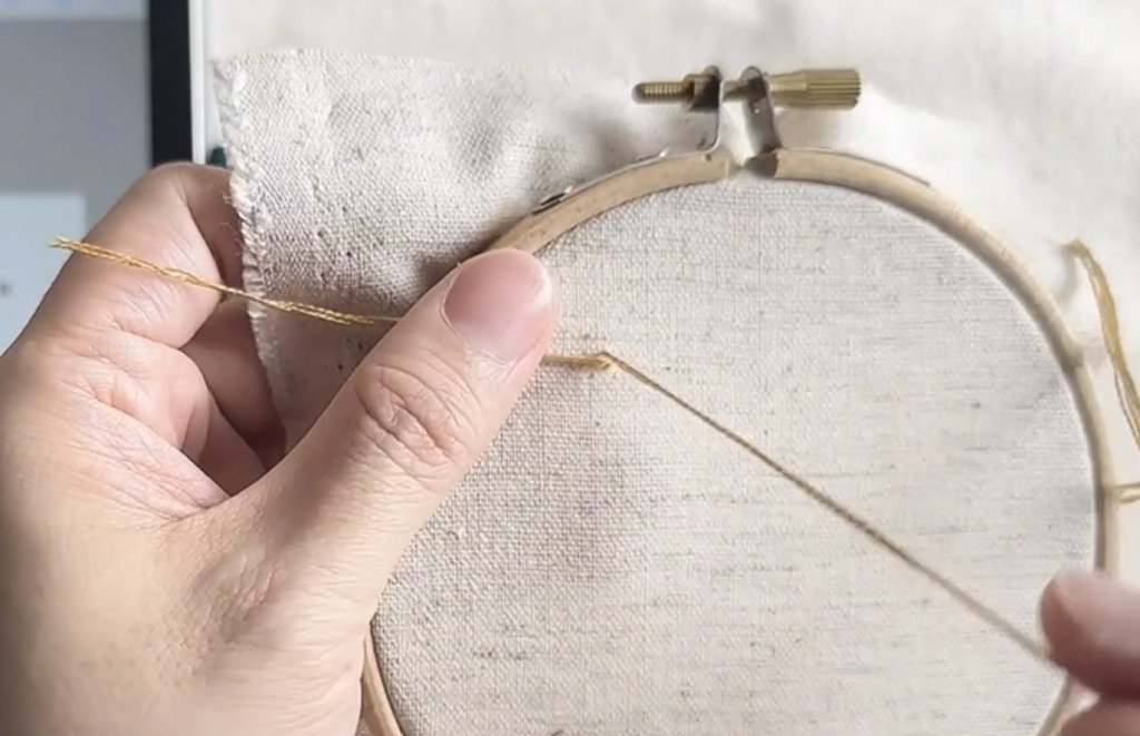 Step 3:壓住線尾,手拉繡線另一端,拉至線尾下方