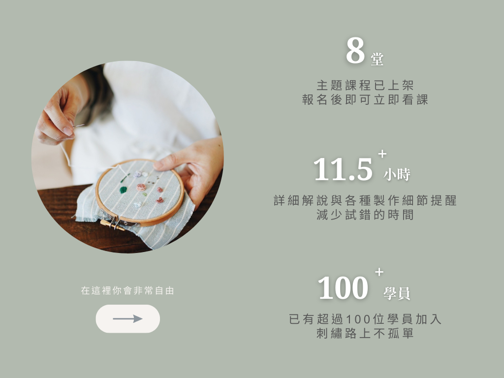 此外,課程提供無限觀看權限,不定期舉辦直播 Q&A,解答疑問、補充針法與技巧。我們還會一起練習蒐集靈感,將資料轉化為個人風格。如果對教學有興趣,完成作品並通過評鑑後,還可獲得一次教案修改輔導,幫助你設計適合自己的教學計劃!但如果沒有開課計畫,只要開心享受刺繡的過程就好!